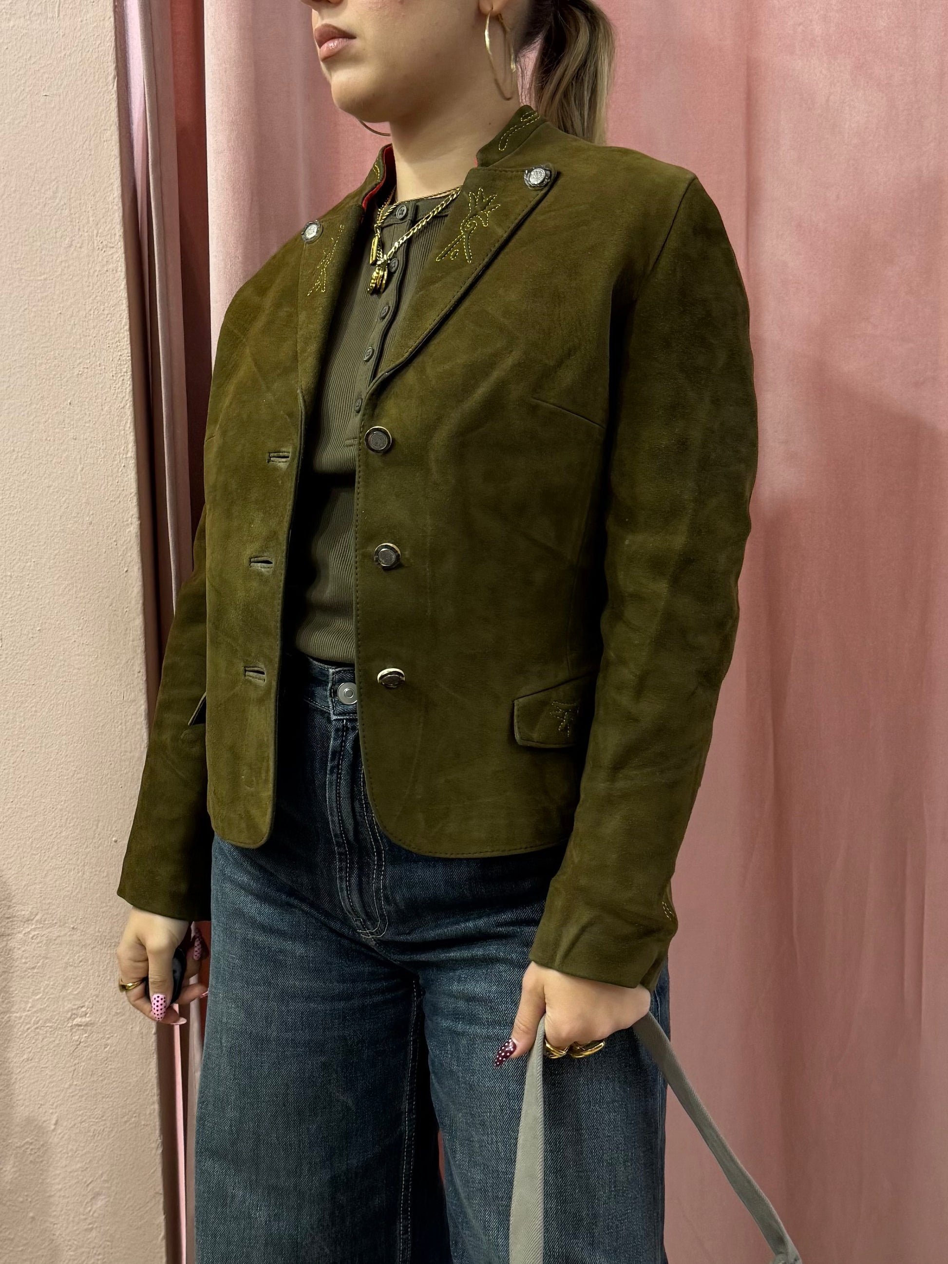 Giacca tirolese vintage in vera pelle verdone, modello molto sciancrato con chiusura tre bottoni, veste molto piccolo; consigliata per tg 36/38 XS